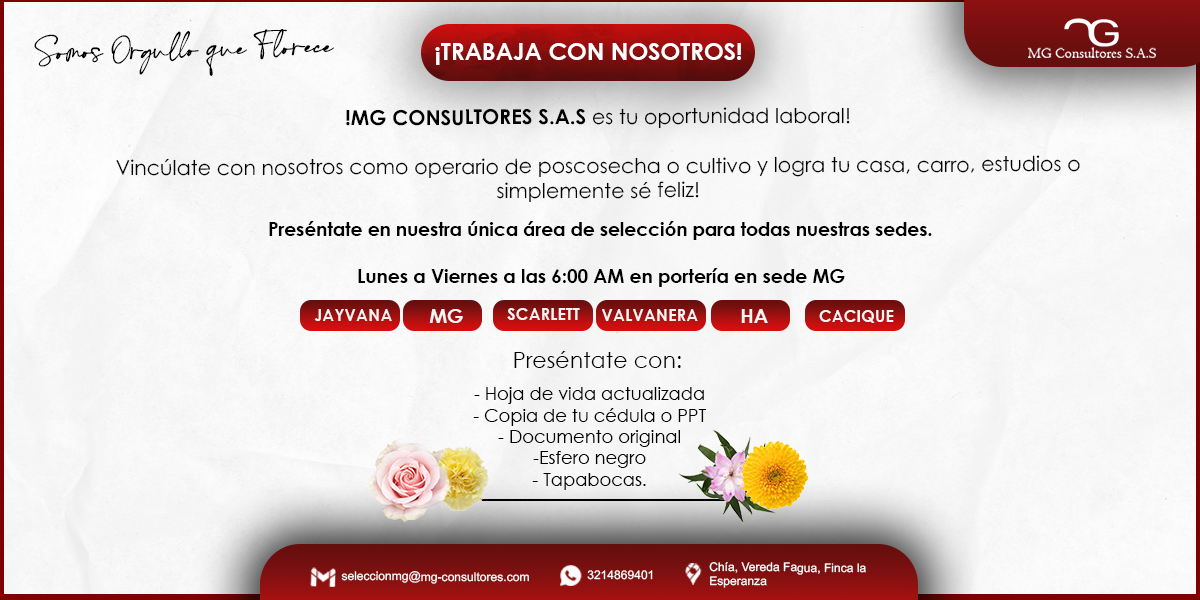 Si tu proyecto es lograr tu casa, carro, estudios o tener una estabilidad para ti y tu familia MG Consultores SAS te ofrece: - Contrato directo con la empresa - Horario Lunes a Viernes 6:00 am a 2:30 pm y Sábados de 6:00am a 11:00am - Salario básico 1.300.000 + auxilio de transporte - Todas las prestaciones de ley - Pagos quincenales