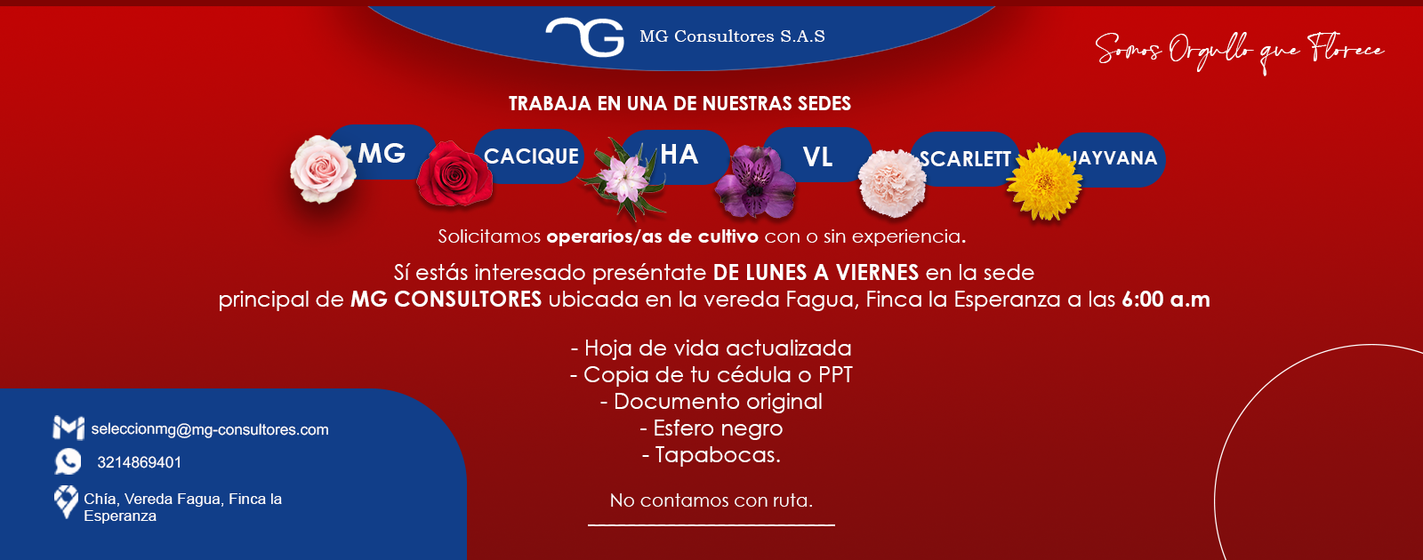 Si tu proyecto es lograr tu casa, carro, estudios o tener una estabilidad para ti y tu familia MG Consultores SAS te ofrece: - Contrato directo con la empresa - Horario Lunes a Viernes 6:00 am a 2:30 pm y Sábados de 6:00am a 11:00am - Salario básico 1.300.000 + auxilio de transporte - Todas las prestaciones de ley - Pagos quincenales